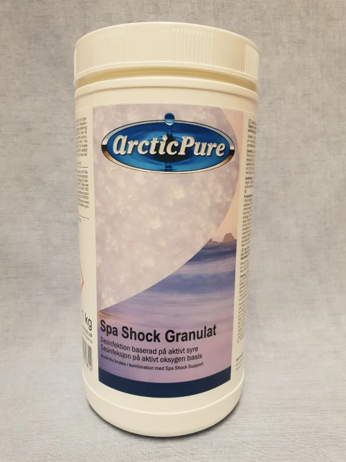 Spa Shock Granulat är en typ av “stötbehandling” (shock treatment) som tillfälligt höjer nivån av oxidanter i spavattnet för att snabbt bryta ner och avlägsna organiska ämnen. Dessa organiska ämnen kan bidra till att vattenkvaliteten försämras genom att orsaka grumlighet, dålig lukt och skumbildning. Med tiden kan de även leda till alg- och bakterietillväxt om de inte hanteras korrekt.